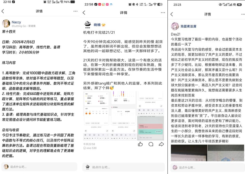 此次“21天习惯养成”寒假学习打卡活动,不仅让百余名学子在寒假实现了自我提升,更让“坚持”与“自律”成为青春成长的重要底色。未来,两学院将继续深化育人实践,推出更多特色活动,为学子们的成长搭建更广阔的舞台,助力两院学子以更饱满的姿态、更坚定的信念,奔赴未来的学习与成长之路。